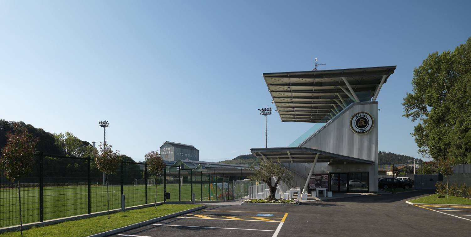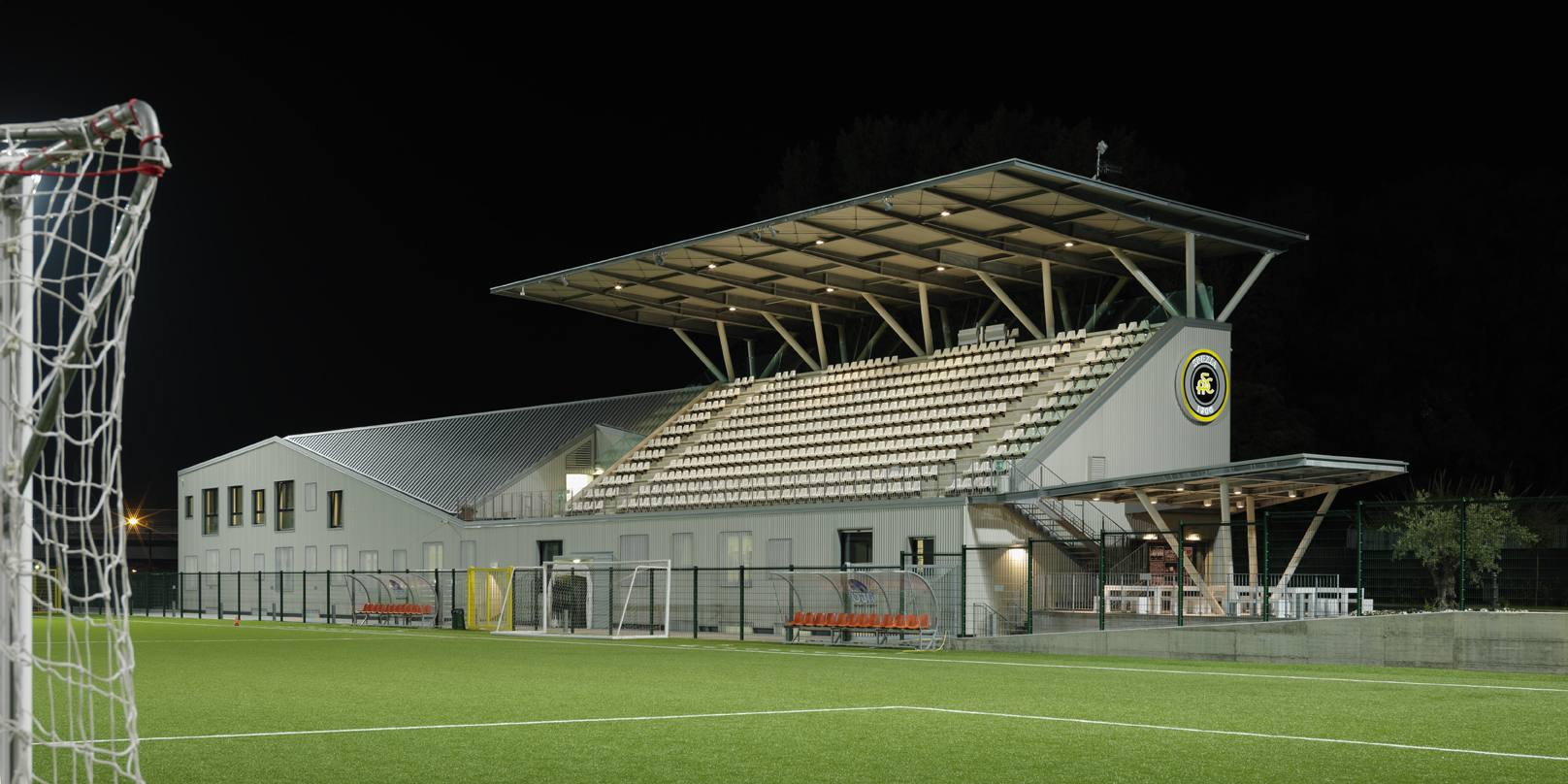 - Realizzazione di copertura per la zona tribuna, per la zona edificio e per la zona bar in pannelli sandwich costituiti da lamiera superiore grecata in alluminio, coibentata in poliuretano espanso, con gronde perimetrali e mantovane in alluminio, compreso sistema linea vita.