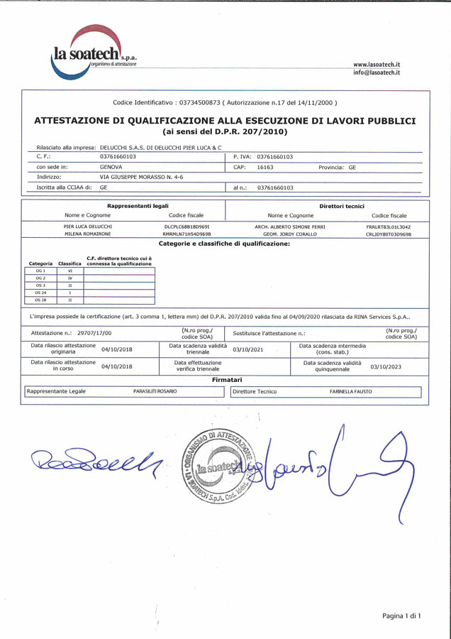 Nel mese di ottobre abbiamo infatti ottenuto il rinnovo con l'ente RINA per la certificazione ISO 9001:2015 relativa alla qualità e abbiamo ottenuto nuovamente anche l'attestazione SOA, aumentata di classifica per OG1 dove siamo passati da classifica V a classifica VI. Inoltre, abbiamo aggiunto anche la categoria OG2 - classifica IV e la categoria OS24 - classifica I ottenendo con estrema soddisfazione l'attestato SOA per le seguenti categorie di qualificazione all'esecuzione di lavori pubblici: